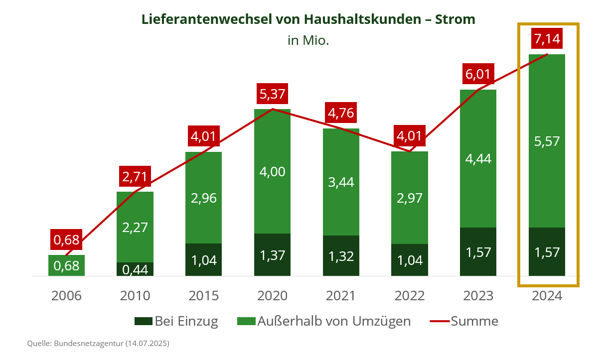 Im Jahr 2024 haben rund 7,1 Millionen Stromkunden und 2,2 Millionen Gaskunden ihren Anbieter gewechselt – so viele wie noch nie zuvor. Das zeigen die aktuellen Marktdaten der Bundesnetzagentur.