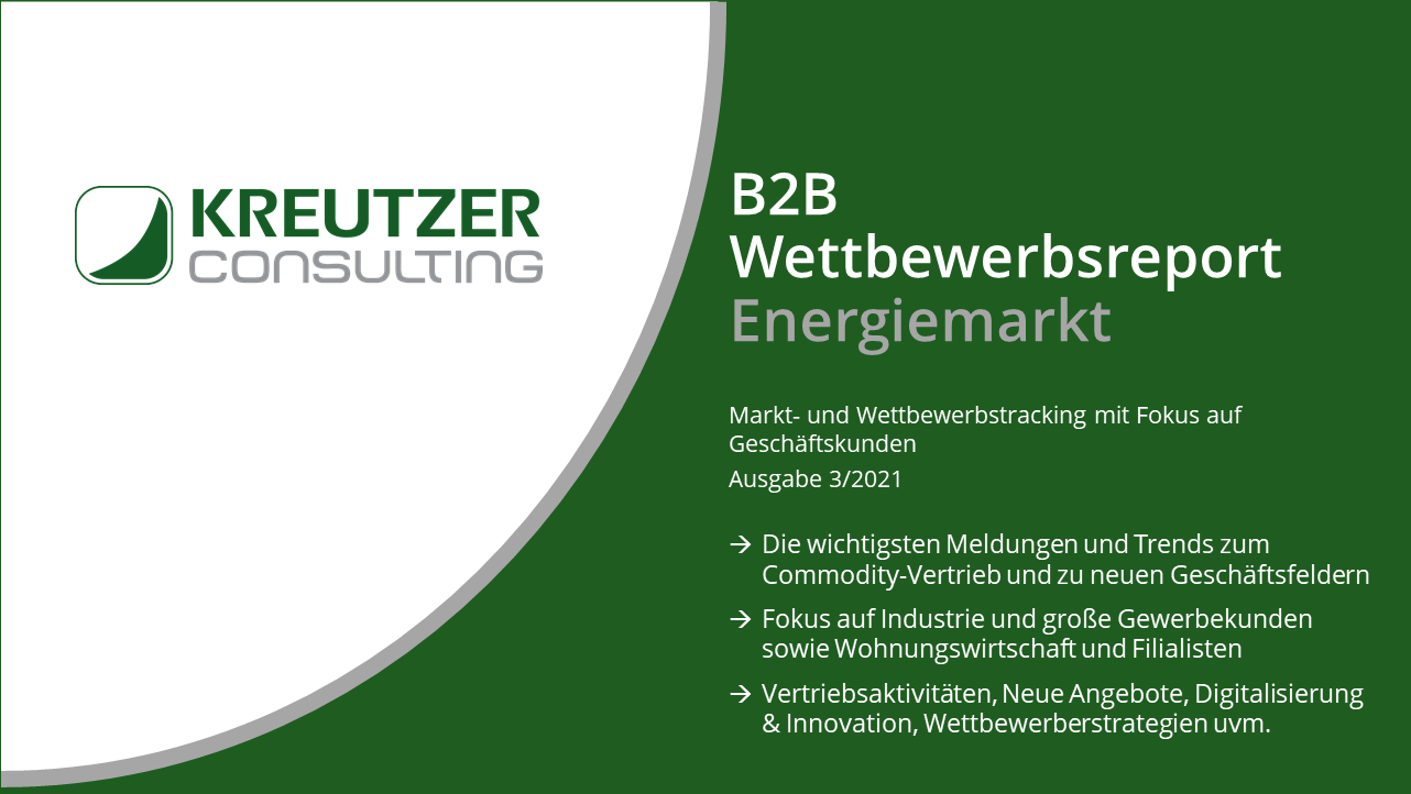 Mit dem B2B-Wettbewerbsreport hat Kreutzer Consulting seit Januar 2021 ein neues Berichtsformat aufgelegt, dass neben dem klassischen Commodity-Vertrieb insbesondere auch Trends und Entwicklungen in neuen Geschäftsfeldern wie der Elektromobilität abbildet. Im Fokus stehen dabei sowohl große Industrie- und Geschäftskunden als auch das komplexere SLP-Segment in etwa ab 30.000 kWh Jahresstromverbrauch. Ebenso werden die Wettbewerbsaktivitäten in der Wohnungswirtschaft und bei Filialisten berücksichtigt.