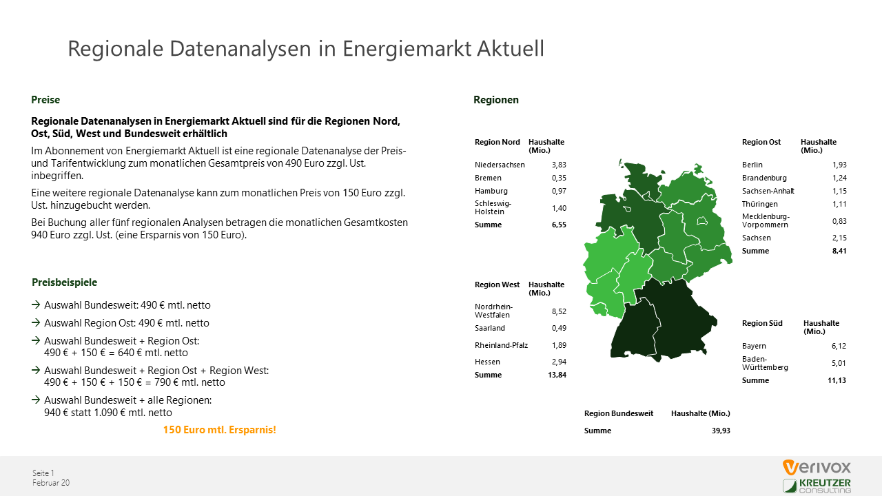 Um Versorgern Informationen zu ihrem vertrieblichen Umfeld zu bieten, sind Analysen der Preis- und Tarifdaten für folgende Regionen erhältlich: