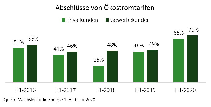 70 % der Gewerbekunden, die im ersten Halbjahr 2020 einen Stromtarif über Verivox abgeschlossen haben, entschieden sich für einen Tarif mit Ökostrom. Dies entspricht einem Anstieg um rund 21 Prozentpunkte gegenüber dem gleichen Vorjahreszeitraum. Bei den Privatkunden lag die Ökostrom-Abschlussquote im ersten Halbjahr 2020 mit 65 % ebenfalls auf höherem Niveau als im vergangenen Jahr, jedoch geringer als bei Gewerbekunden. Bereits seit 2016 ist bei Gewerbekunden eine höhere Relevanz des Öko-Themas als bei Privatkunden zu beobachten. Dies geht aus der kürzlich erschienenen Ausgabe der Wechslerstudie Energie zum 1. Halbjahr 2020 von Kreutzer Consulting und Verivox hervor.