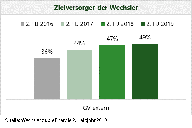 Wie aus der Studie außerdem hervorgeht, haben die überregional aktiven Grundversorger wie E.ON, innogy, Vattenfall oder eprimo, aber auch viele Stadtwerke, ihren Anteil an der Neukundenakquise ausgebaut und 2019 deutlich mehr Kunden gewonnen als die unabhängigen Anbieter.