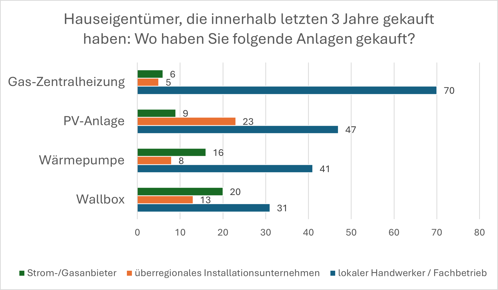 Während beim Kauf einer Öl- oder Gas-Zentralheizung noch 70 % der Verbraucher den Weg über das lokale Handwerk wählten, waren es bei PV-Anlagen nur noch 47 % und bei Wärmepumpen 41 %. Große überregionale Anbieter erreichen im PV-Markt 23 % Marktanteil, Strom- und Gaslieferanten kommen bei Wärmepumpen auf 16 %.