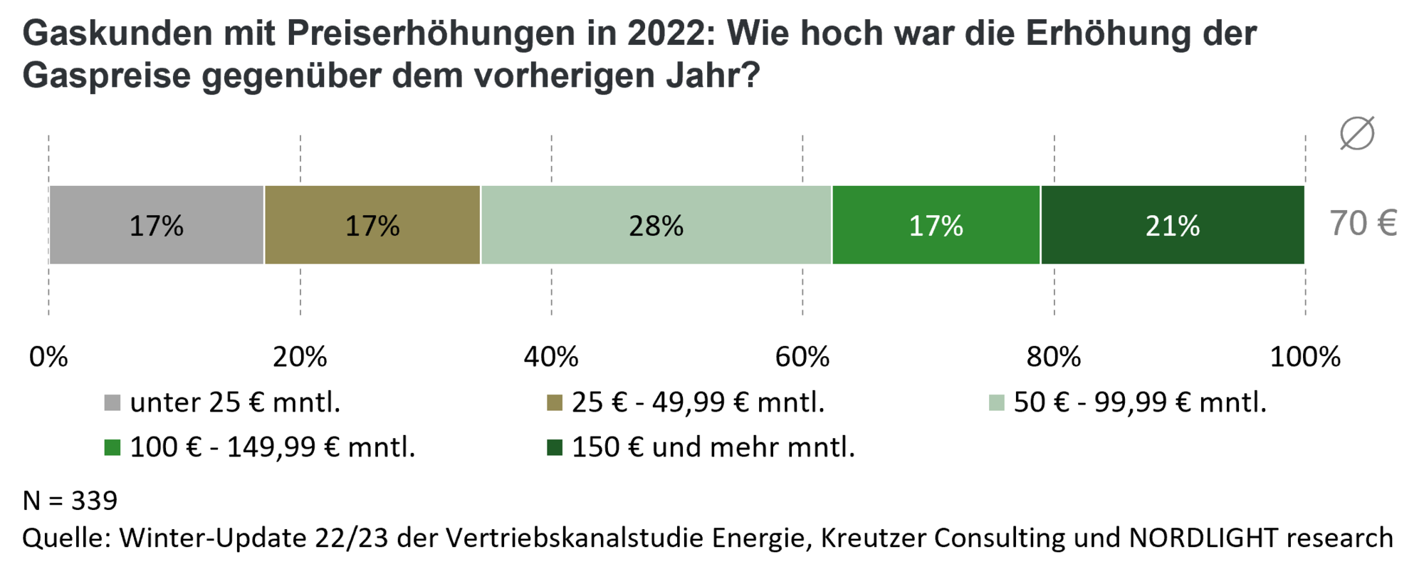 Zum Jahreswechsel haben 80 Prozent der privaten Gaskunden eine Preiserhöhung ihres Versorgers wahrgenommen. Gegenüber Frühjahr 2022 ist deren Anteil um 18 Prozentpunkte gestiegen. Mit einer durchschnittlich wahrgenommenen Preis- bzw. Abschlagserhöhung um 70 Euro/Monat bei Gas sind die Kostensteigerungen spürbar und dürften sich auf die Kaufkraft der Verbraucher auswirken. Dies geht aus dem im Dezember 2022 erschienenen Vertriebskanalstudie Energie Winter-Update 22/23 von Kreutzer Consulting und NORDLIGHT research hervor.