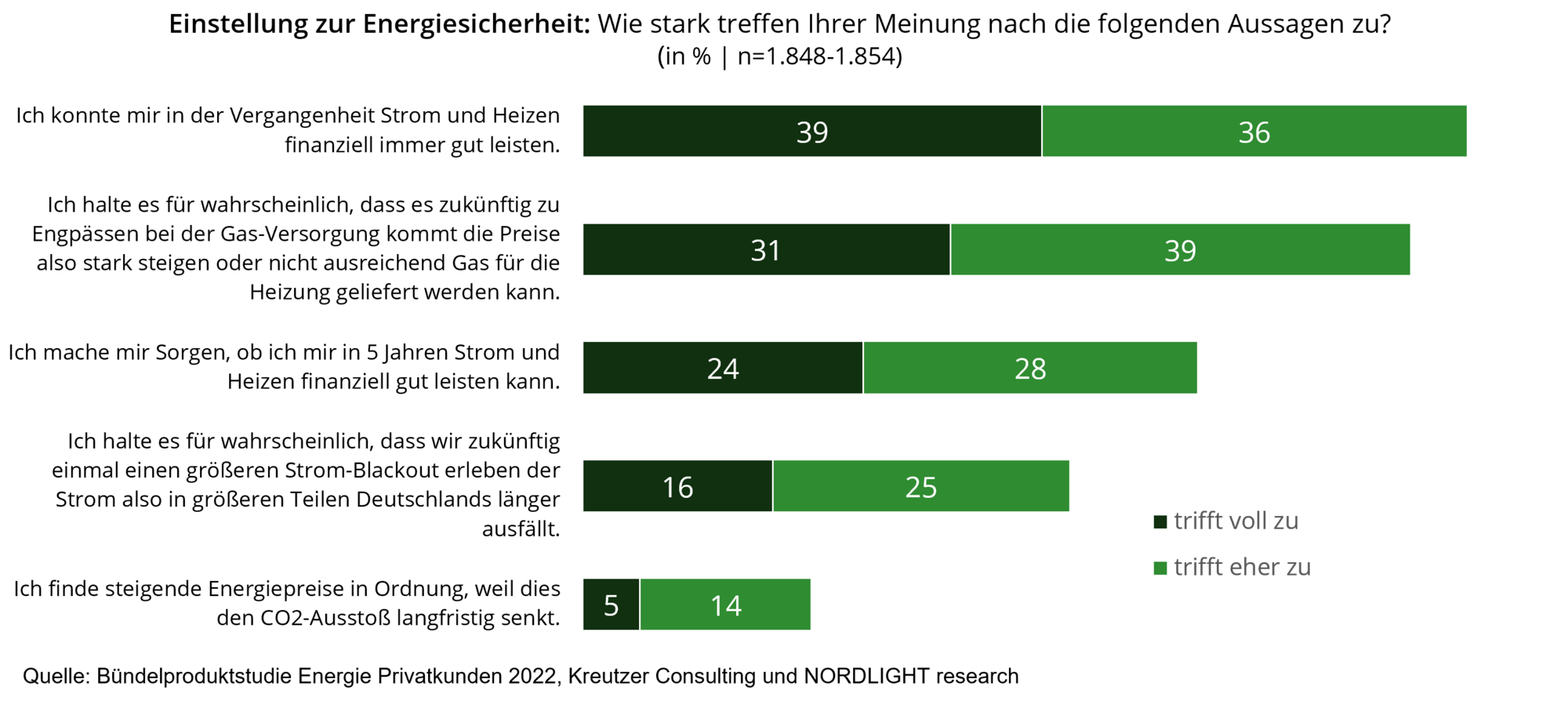 Mit Beginn der Energiepreiskrise im Lauf des zweiten Halbjahres 2021 hat sich bereits gezeigt, dass die Zeiten günstiger Energiepreise zu Ende sind. Durch den Russland-Ukraine-Krieg steht auch die Frage der Versorgungssicherheit in Frage. Dies führt in der Bevölkerung zu großer Verunsicherung. So haben 70 % Angst vor Versorgungsengpässen bei Gas, 41 % halten zukünftig länger anhaltende Strom-Blackouts für wahrscheinlich und über die Hälfte glaubt, sich Energie in fünf Jahren nicht mehr leisten zu können. Dies geht aus einer Zusatzbefragung der im Mai 2022 erschienenen Bündelproduktstudie Energie Privatkunden 2022 von Kreutzer Consulting und NORDLIGHT research unter knapp 2.000 deutschen Verbrauchern hervor.
