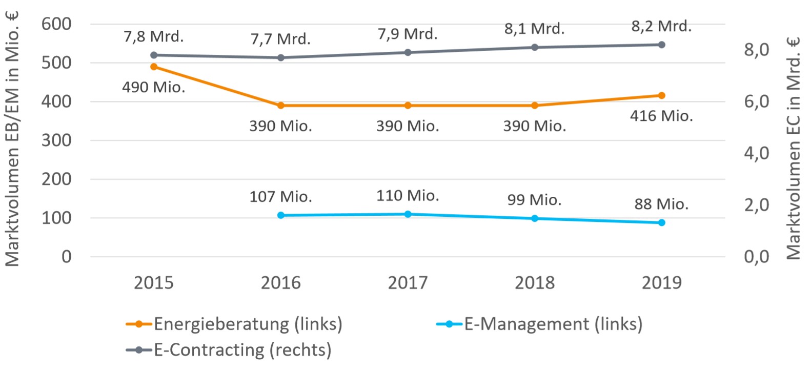 Das Geschäft mit Energiedienstleistungen (EDL) hat ein riesiges Marktvolumen in Deutschland – laut den kürzlich veröffentlichten Ergebnissen der letzten BfEE-Marktanalyse rund 8,7 Mrd. Euro im Jahr 2019. Der Löwenanteil davon entfällt auf das B2B-Segment, die Wohnungswirtschaft und den öffentlichen Sektor. Das Potenzial ist allerdings noch deutlich größer und die öffentliche Hand ist bemüht, Dienstleistungen für mehr Energieeffizienz und dezentrale erneuerbare Energien zu fördern. Während das Wachstum in den letzten Jahren eher moderat ausfiel, wie die obige Grafik aus der BfEE-Analyse zeigt, könnten verschiedene Faktoren in den kommenden Jahren einen stärkeren Anstieg begünstigen: