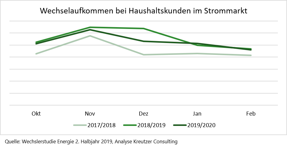Eine Analyse des Wechselaufkommens im Rahmen der Wechslerstudie Energie 2. Halbjahr 2019 von Kreutzer Consulting und Verivox zeigt, dass die BEV-Insolvenz die zeitliche Struktur des Wechselaufkommens auch längerfristig beeinflusst. So enden nun die Vertragslaufzeiten von noch mehr Energieverträgen als bisher in den Wintermonaten, so dass es entsprechend in dieser Zeit zu einem noch höheren Wechselaufkommen kommt als früher. Die Zahlen zum Winterhalbjahr 2019/2020 bestätigen dies.