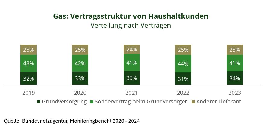 Seit 2019 ist ein kontinuierlicher Rückgang des Marktanteils von Sonderverträgen bei Grundversorgern (nach Verbrauch) erkennbar. Im Vergleich zu 2022 ist 2023 ein Rückgang um drei Prozentpunkte zu beobachten. Seit 2019 ist die Quote um 10 % gesunken. Der Anteil grundversorgter Kunden ist hingegen seit 2019 weitgehendst stabil geblieben.
