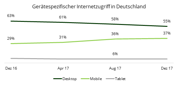 Die Veränderungen des Google-Suchalgorithmus fußen auf der zunehmenden Nutzung mobiler Endgeräte wie Smartphones, die bspw. auch in Deutschland stetig zunimmt, während Desktop-PCs immer weniger verwendet werden (siehe Graph). Google hat auf diese Entwicklung reagiert und einen Mobile-First-Suchindex aufgebaut. Initiiert ein Nutzer eine Suche über ein mobiles Endgerät, bevorzugt Google die mobile Version einer Webseite und bewertet deren Inhalte, sodass diese in der Ergebnisliste weiter oben erscheinen. Zwar werden die Desktop-Versionen der Webseite weiterhin und vor allem bei der Desktop-Suche berücksichtigt, langfristig soll aber – dem Nutzungsverhalten geschuldet – der Mobile-First-Index den Desktop-Index ganz ablösen. Somit müssen Webseiten auf die Nutzungsgewohnheiten und die neuen technologischen Anforderungen von Google ausgerichtet werden, damit diese im relevanten Bereich auftauchen.