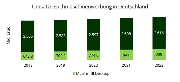 Neben der organischen Auffindbarkeit wird im SEM auch die mobile Suchmaschinenwerbung (SEA) weiter an Bedeutung gewinnen. Laut dem Bundesverband für digitale Wirtschaft (BVDW e.V.) hat im Jahr 2017 die digitale Werbung in Form von Display-Werbung und Suchwortvermarktung mit 29,9 Prozent der Nettowerbeinvestitionen erstmals das Fernsehen mit 29,7 Prozent als wichtigsten Werbeträger überholt. Die Investitionen in SEA stiegen laut dem BVDW e.V. zwischen 2015 und 2016 um fünf Prozent auf 3,08 Mrd. Euro. Im Jahr 2022 sollen sie laut dem Statista Digital Market Outlook bei 3,5 Mrd. Euro liegen, wobei dann 2,6 Mrd. Euro auf die Desktop- und 909 Mio. Euro auf die Mobile-Suchmaschinenwerbung entfallen sollen (siehe Diagramm). Das Umsatzwachstum von Mobile-SEA soll zwischen 2018 und 2022 allerdings 41,6 Prozent betragen, während Desktop-SEA nur knapp zwei Prozent erzielt (siehe Diagramm).