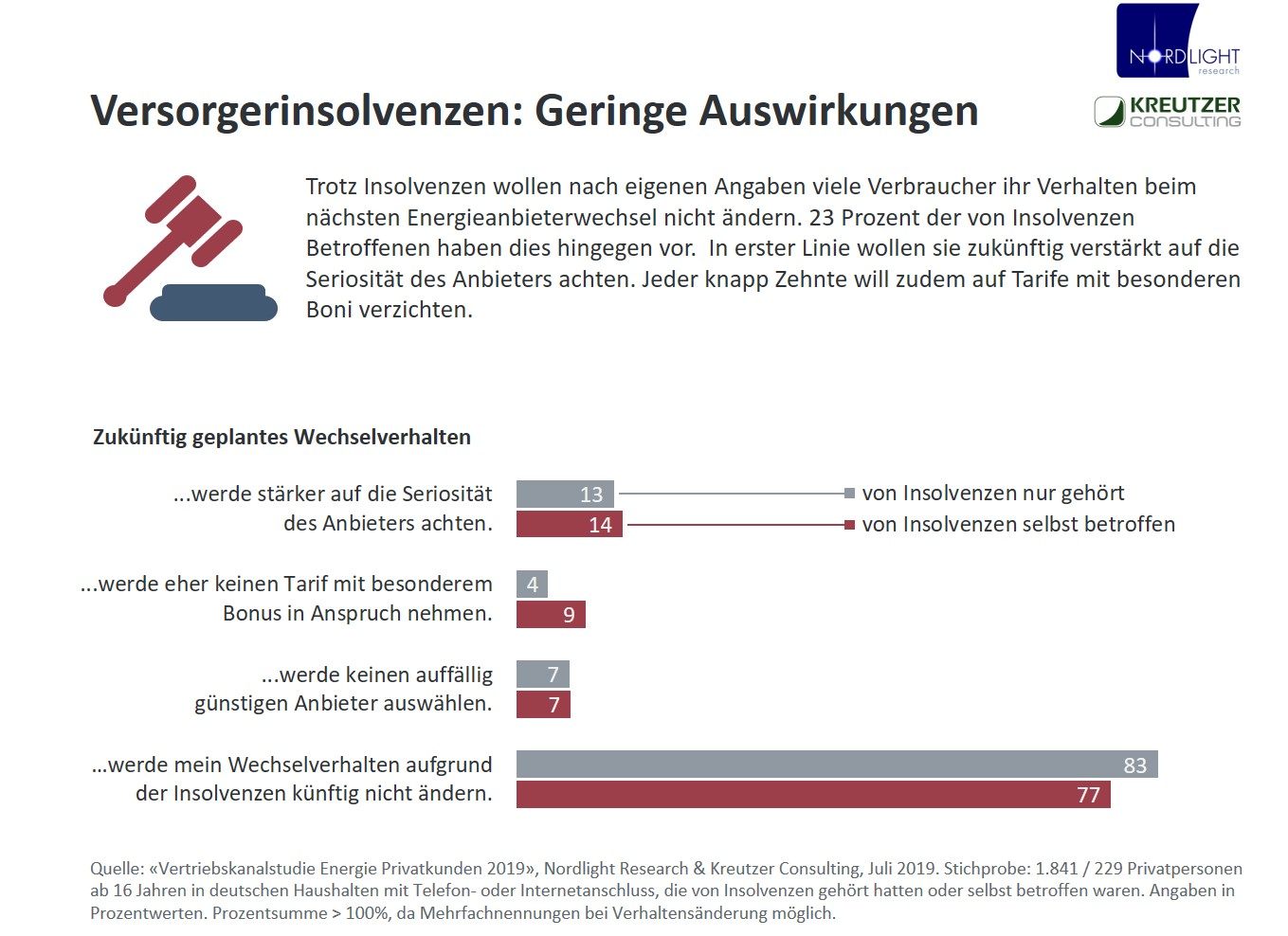 Die Betroffenen zeigen sich jedoch meist wenig verunsichert. Nur 14 Prozent derer, die zum Zeitpunkt der Insolvenz Kunde bei einem betroffenen Versorger waren, wollen künftig stärker auf die Seriosität des Anbieters achten. Dies zeigt eine Sonderbefragung im Rahmen der soeben erschienenen Vertriebskanalstudie Energie 2019. Sieben Prozent gaben an, keinen auffällig günstigen Tarif wählen zu wollen. Ganz ähnlich sieht es bei den Kunden aus, die von den Insolvenzen nur gehört haben. 83 Prozent wollen ihr Verhalten zukünftig aufgrund der Insolvenzen überhaupt nicht ändern. Indessen hatten 59 Prozent aller Energiekunden von den Insolvenzen gar nicht erst gehört.