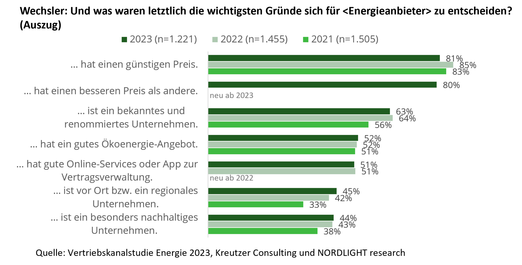 Vor allem in Zeiten der Energiepreiskrise hat zudem das Renommee des Unternehmens an Relevanz gewonnen. Kunden suchen demnach weiterhin verstärkt nach bekannten, größeren oder regionalen Unternehmen, deren Ausfallrisiko gering erscheint.