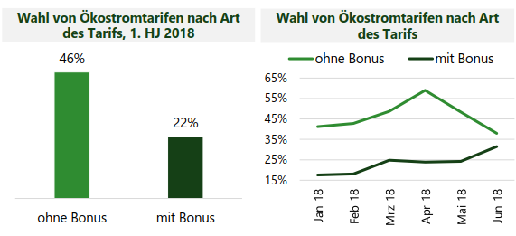 München/Heidelberg, 07.09.2018 – Kunden, die beim Wechsel des Stromversorgers auf einen Bonus verzichten, schließen mehr als doppelt so häufig einen Ökostromvertrag ab, als die Bonusnutzer. Mit 46 Prozent entscheidet sich knapp die Hälfe der Wechsler im sogenannten No-Bonus-Bereich für ein Ökostromangebot. Unter den Verbrauchern, die einen Stromtarif mit Bonus wählen, bezieht hingegen nur etwa jeder Fünfte Ökostrom.