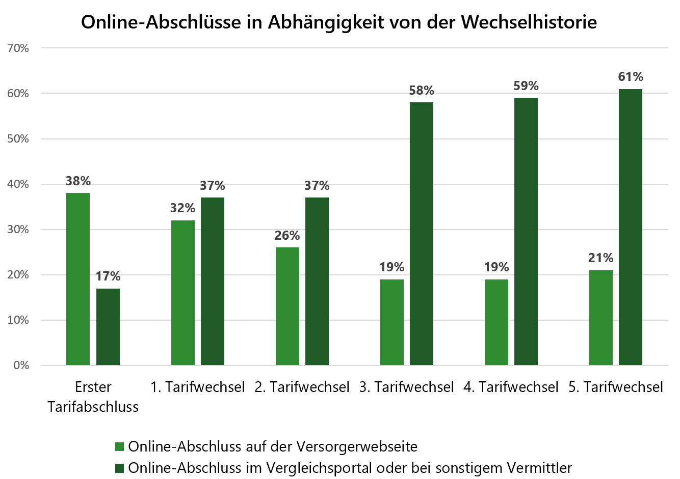 Auffällig ist auch, dass die Nutzung von Abschlusskanälen abseits des Internets bei Kunden mit längerer Wechselhistorie deutlich abnimmt. Beim ersten Tarifabschluss nutzen immerhin noch 45 Prozent der Verbraucher einen Offline-Kanal wie Telefon, Brief oder das Kundencenter. Beim ersten Wechsel sinkt dieser Anteil bereits auf rund 30 Prozent, während es beim fünften Wechsel nur noch knapp 20 Prozent sind.